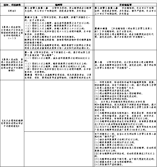 结合上述图表对比,聚众赌博罪主要是《最高人民法院、最高人民检察院关于办理赌博刑事案件具体应用法律若干问题的解释》(以下简称“两高解释”)规定的以营利为目的,组织3人以上赌博并且抽头渔利达5000元以上或赌资数额累计达到5万元以上的或参赌人数累计达到20人以上的行为,明知他人实施赌博犯罪活动,而为其提供资金、计算机网络、通讯、费用结算等直接帮助的,以赌博罪的共犯论处;网络开设赌场罪则主要是《关于办理网络赌博犯罪案件适用法律若干问题的意见》(以下简称“网赌意见”)中的规定,行为人利用互联网、移动通讯终端等传输赌博视频、数据,组织赌博活动,建立赌博网站并接受投注的、建立赌博网站并提供给他人组织赌博的、为赌博网站担任代理并接受投注的、参与赌博网站利润分成的,其中实施上述行为并抽头渔利数额累计达到3万元以上、赌资数额累计达到30万元以上的、参赌人数累计达到120人以上的、建立赌博网站后通过提供给他人组织赌博违法所得数额在3万元以上、参与赌博网站利润分成违法所得数额在3万元以上、为赌博网站招募下级代理,由下级代理接受投注、招揽未成年人参与网络赌博的属于情节严重情形。