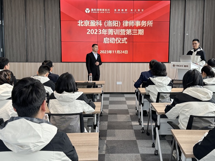 2023年11月24日下午,由盈科洛阳青工委组织的“菁训营”第三期活动正式启动。盈科洛阳律所执行主任张亮、管委会主任刘伟、党支部书记魏俊卿、管委会副主任张运超、客服中心主任闫宁、青工委主任王琦以及第三期全体学员到场参加,开营仪式由申旭营主持。